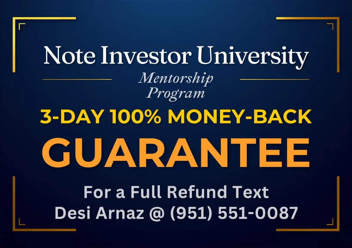 Investment Risk Acknowledgment: Investing in mortgage notes, like any investment, carries inherent risks, and it is possible to lose some or all of your investment. The strategies taught in our programs are general in nature and may not be suitable for every individual or situation. We do not provide personalized financial, legal, or investment advice. We make no representations about the probability that any actual or hypothetical investment will achieve a particular result.